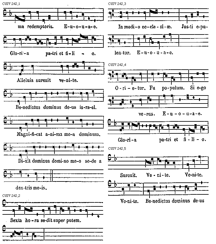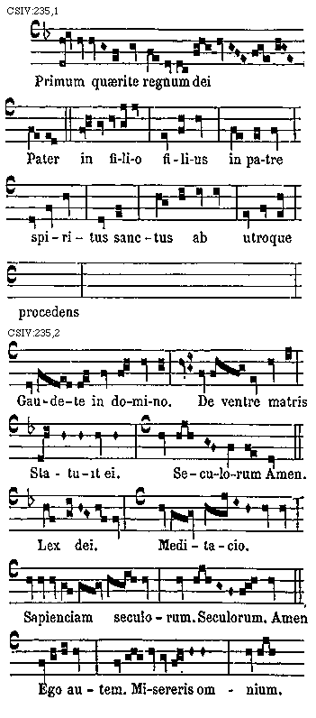 Praeterea si in loco supradicto mutatio fiat et descensio fit in F gravem. antequam ascendatur ad c acutam vel d aut e acutas post mutationem, per b molle in b acuto cantari oportet, ut patet in sequentibus ac consimilibus neupmatibus. Exceptis deutro et tetrardo et ejus plagali, in quibus b molle non intrabit.
