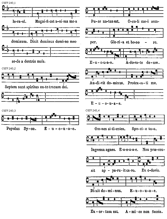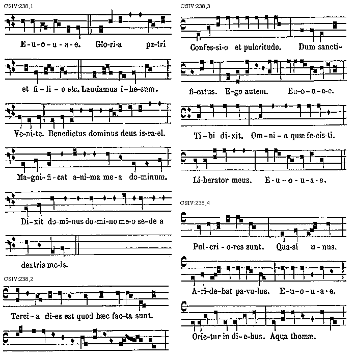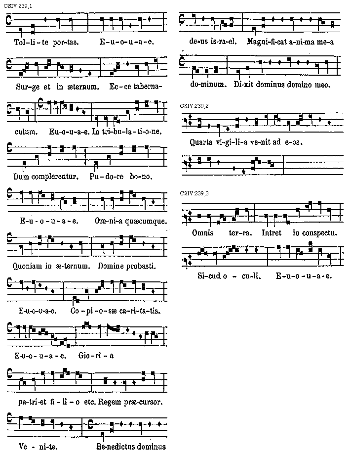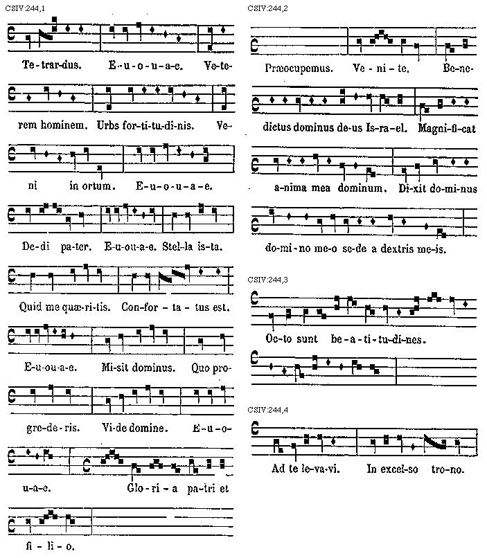 Praeterea tetrardi cantus b molle minime recipit, nec etiam in plaga tetrardi cantum, b molle intrat, quod et sic similis esset in omnibus plagae triti. Unde sciendum est quod [sqb] quadrata in tetrardo et in ejus plagali principatum tenet. Ut autem singulorum modorum elevationes et depositiones a finali regulares breviter demonstretur, ut, si quis modus [sqb] quadratum, et quis modus, b rotundam, ac quis modus utrumque recipit, subscripta formula insinuat.