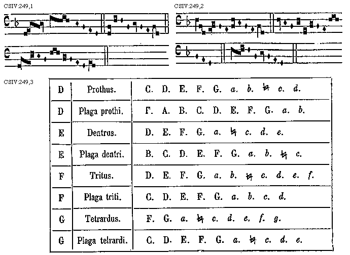 [CSIV:249,3; text: D Prothus C. D. E. F. G. a. b. [sqb] c. d. D Plaga prothi. [Gamma]. A. B. C. D. E. F. G. a. b. E Dentrus. D. E. F. G. a. [sqb] c. d. e. E Plaga dentri. B. C. D. E. F. G. a. b. [sqb] c. F Tritus. D. E. F. G. a. b. [sqb] c. d. e. f. F Plaga triti. C. D. E. F. G. a. b. c. d. G Tetrardus. F. G. a. [sqb]. c. d. e. f. g. G Plaga telrardi. C. D. E. F. G. a. [sqb] c. d. e.]