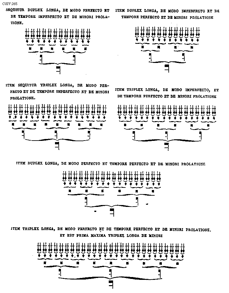 De longis, quaedam est triplex, quaedam duplex, et quaedam simplex. Figura autem triplicis longae, sic formatur [3L]. Figura vero duplicis longae, sic formatur [2L]. Figura simplicis longae est corpus quadratum habens caudam descendendo vel ascendendo in parte dextera, ut hic: [L,Lcs]. Potest etiam longa aliter figurari, ut patebit in ligaturis. Figura vero brevis rectae est corpus quadratum carens omni tractu, ut hic: [B,B]; potest tamen caudari et aliter figurari, ut patebit inferius. Figura autem semibrevis est corpus oblongum ad modum losongae carens omni tractu, ut hic: [S,S,S]; potest tamen caudari et aliter figurari, ut patebit in ligaturis. Figura vero minimae est corpus oblongum ad modum losongae gerens tractum directe supra caput, qui tractus, signum minimitatis vocatur, ut hic: [M,M,M]