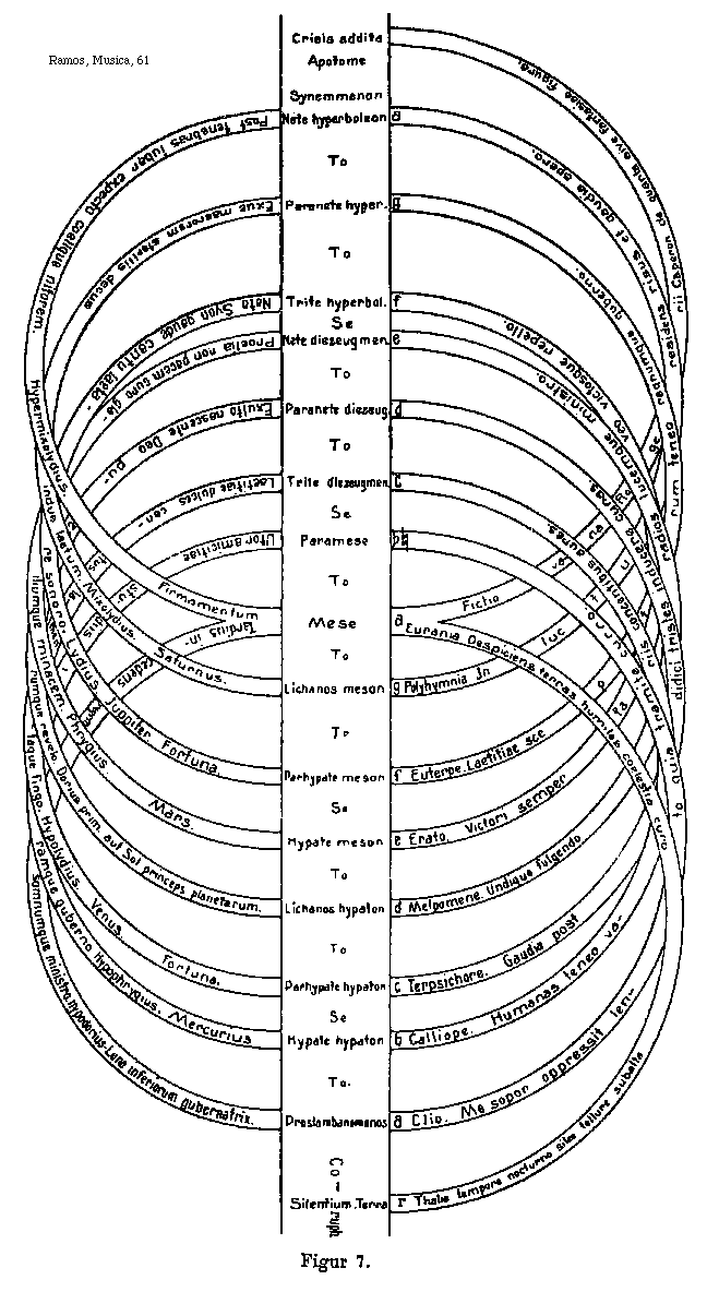 [61][Ramos, Musica, 61; text: Figur 7. Crisis addita, Apotome, Tonus, Semitonium, Coruph, Synemmenon, Nete hyperboleon, Paranete hyperboleon, Trite hyperboleon, Nete diezeugmenon, Paranete diezeugmenon, Trite diezeugmenon, Paramese, Mese, Lichanos meson, Parhypate meson, Hypate meson, Lichanos hypaton, Parhypate hypaton, Hypate hypaton, Proslambanomenos, Silentium. Terra, [Gamma], a, b, c, d, e, f, g, [rob][sqb], Fictia vana Rogerii Caperon de quarta sive fantasiae figura. Polyhymnia. In luctu residens risus et gaudia spero. Euterpe. Laetitiae sceptrum teneo regnumque guberno. Erato. Victori semper faveo victosque repello. Melpomene. Undique fulgendo radios lucemque ministro. Terpsichore. Gaudia post didici tristes inducere curas. Calliope. Humanas teneo variis concentibus aures. Clio. Me sopor oppressit lento quia tramite curro. Thalia tempore nocturno sileo tellure subalta, Eurania. Despiciens terras humiles coelestia curo. Post tenebras iubar expecto coelique nitorem. Hypermixolydius. Firmamentum. Exue maerorem sterilis decus indue laetum. Mixolydius. Saturnus. Nata Syon gaude cantu laetare sonoro. Lydius. Juppiter. Fortuna. Proelia non pacem curo gladiumque minacem. Phrygius. Mars. Exulto nascente Deo puerumque revelo. Dorius primus aut Sol princeps planetarum. Laetitiae dulces cantus lamentaque fingo. Hypolydius. Venus. Utor amicitiae studius iramque guberno. Hypophrygius. Mercurius, Tardius incedens regem somnumque ministro. Hypodorius--Luna inferiorum gubernatrix.]