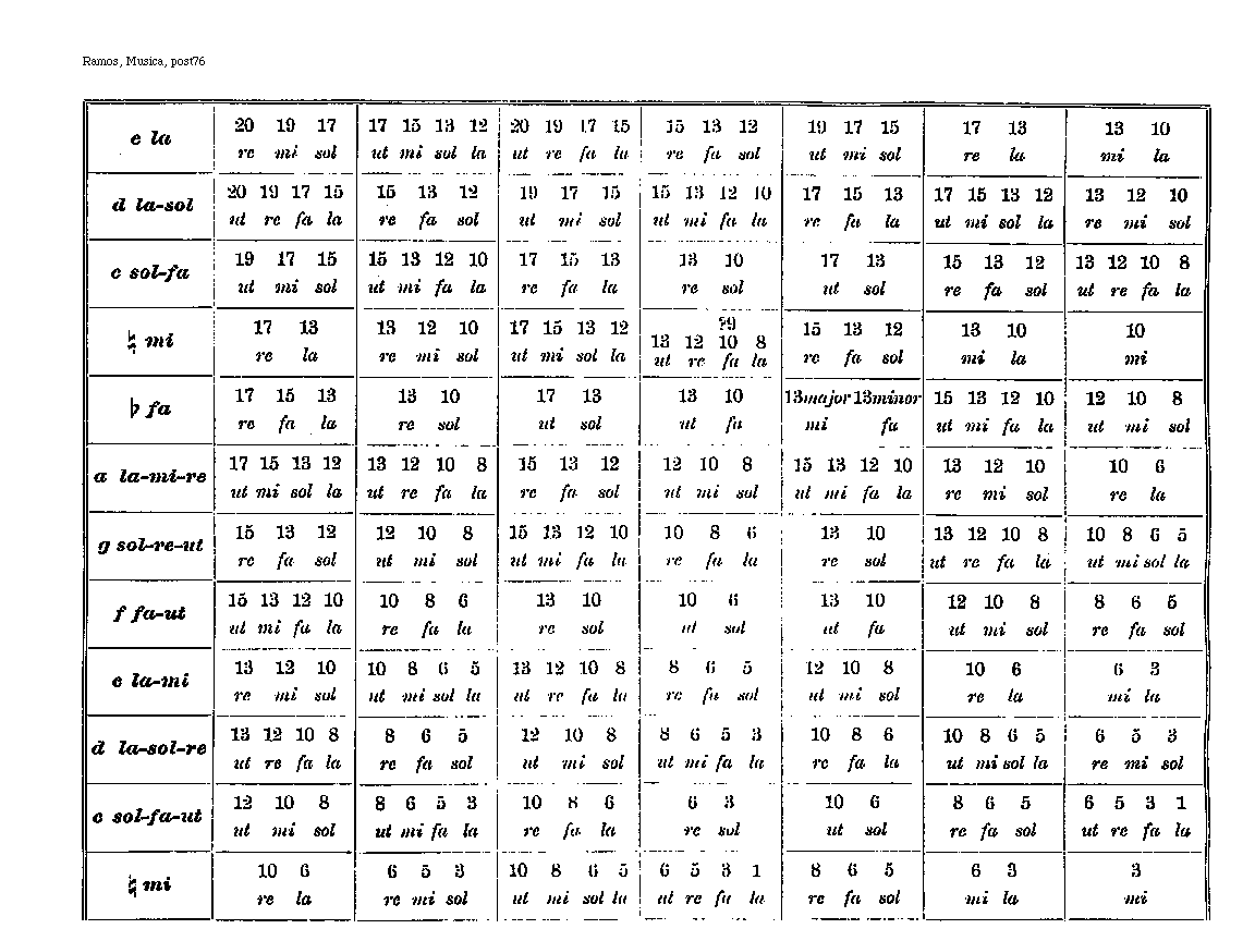 [76]locus c sol-fa-ut caruit mi quinta, quoniam contra f fieri non potuit. Ideo tantum re sol obtinuit, verum c fa-ut re fa sol sibi vendicat inhaerere. Sed si contingat la quintum compositum locum habere, componendus carebit eadem, quoniam ultima la nulla vox est in ista doctrina confusa. Cum igitur alia gammata componere velis, signis 8 comparatis idem eveniet, ac etiam in complemento idem faciendum. Quae omnia in subiecta figura continentur.