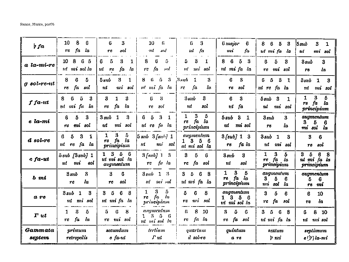 [Ramos, Musica, post76; text: e la, d la-sol, c sol-fa, [sqb] mi, [rob] fa, a la-mi-re, g sol-re-ut, f fa-ut, e la-mi, d la-sol-re, c sol-fa-ut, d sol-re, c fa-ut, b mi, a re, [Gamma] ut, e([rob]) la-mi, Gammata septem, primum retropolis, secundum, tertium, quartum, quintum, sextum, spetimum, ut, re, mi, fa, sol, la, 1, 3, 5, 6, 8, 10, 12, 13, 15, 17, 19, 20]