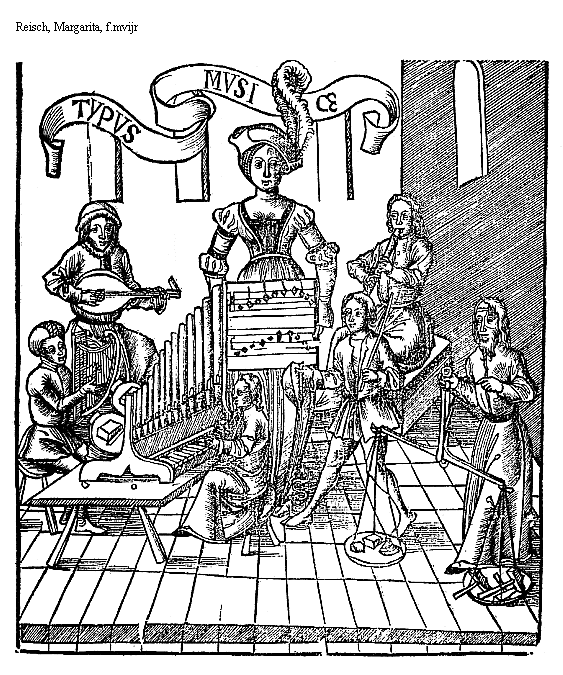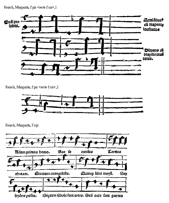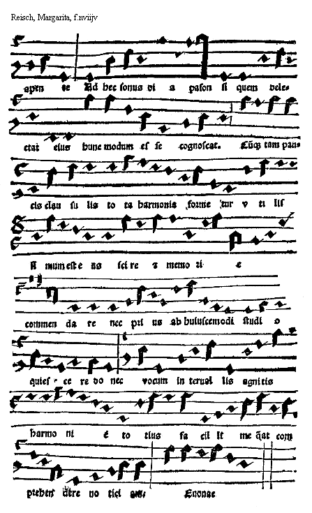 [f.pirbis recte f.oirbis][Reisch, Margarita, f.pirbis recte f.oirbis; text: BisDiapason, Diapason cum diapente, Diapenthe, Tetracordum primum et hipaton, Diatesseron, Tetracordum secundum Meson, Semitonium maius, minus, coma, tertium, quartum excellentium, proslambomenos. hipatehipaton. parhipathehipaton, lichanos hipaton. hipatemeson, parhipatemeson, lichanosmeson, Mese, Tritesinemenon, paramese, paranete sinemenon, Tritediezeugmenon, Netesinemenon, paranetediezeugmenon, Netediezeugmenon. Tritehiperboleon. Paranethehiperboleon, Netehiperboleon. Clauium differentie, Claues, primus [sqb] duralis, naturalis, bmollis, Secundus, Tertius, vt, re, mi, fa sol, la, Graues vel Capitales, finales, Affinales, Acute, excellentes, Germinate, [Gamma], A, B, [sqb], C, D, E, F, G, a, b, [sqb][sqb], c, d, e, f, g, aa, bb, cc, dd, e, Descriptio Inuentionis Semitonij minoris. Diapason intensum, Diatesseron remissum, diapenthe, sumptum, semitonium minus, tonus, apotome, g, k, n, a, f, h, d, l, b, m, e, c]