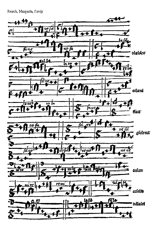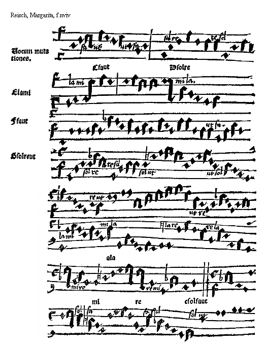 [Reisch, Margarita, f.nviv; text: Vocum mutationes. Elami, Ffaut, Gsolreut, Cfaut, Dsolre, alamire, csolfaut, ut re mi fa sol la]