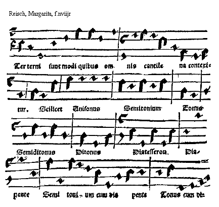 [Reisch, Margarita, f.nviijr; text: Ter terni sunt modi quibus omnis cantilena contexitur. Scilicet Vnisonus Semitonium Tonus Semiditonus Ditonus Diatesseron Diapente Semitonium cum diapente Tonus cum diapente]