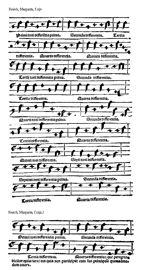 [Reisch, Margarita, f.oijv; text: Primi toni differentia prima. Secunda, Tertia, Quarta, Quinta, Tertij, Quarti, Quinti, Sexti, Septimi]