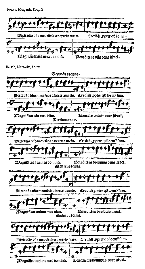 [Reisch, Margarita, f.oiijr,2; text: Primus tonus. Dixit dominus domino meo: sede a dextris meis. Credidi propter quod locutus sum Magnificat anima mea dominum. Benedictus dominus deus israel.]