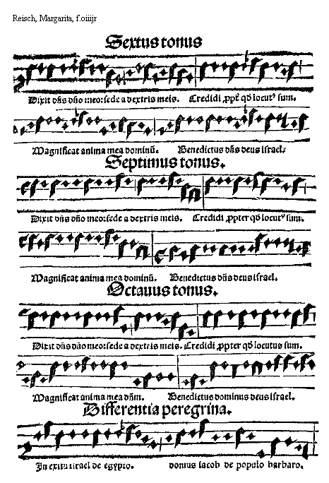 [f.oiiijr][Reisch, Margarita, f.oiiijr; text: Sextus tonus. Dixit dominus domino meo: sede a dextris meis. Credidi propter quod locutus sum. Magnificat anima mea dominum. Benedictus dominus deus israel. Septimus tonus. Octauus tonus. Differentia peregrina. In exitu israel de egypto. Domus iacob de populo barbaro.]