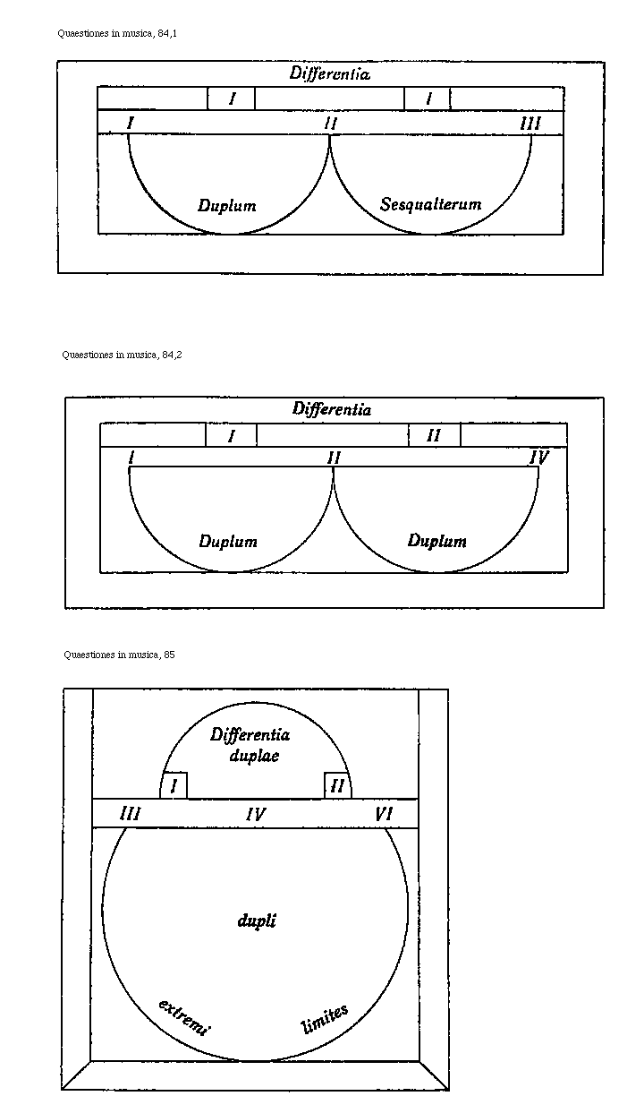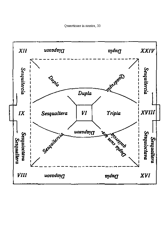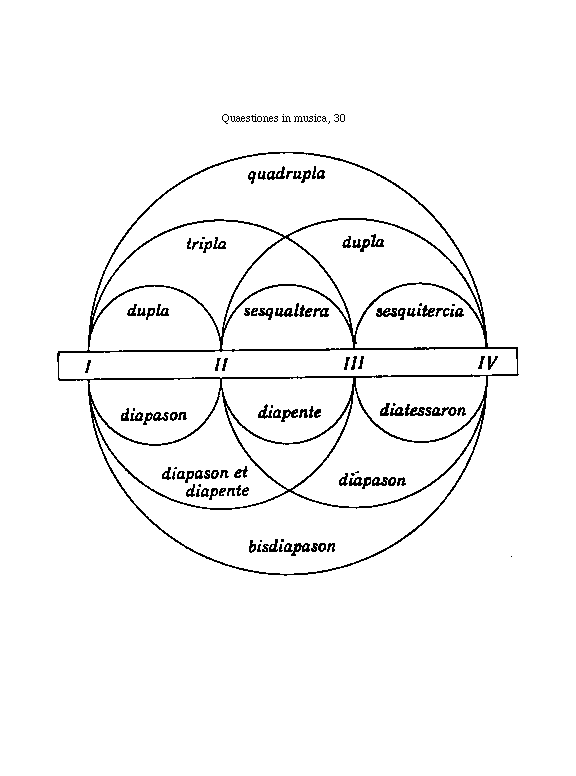 [Quaestiones in musica, 30; text: I, II, III, IV, dupla, tripla, quadrupla, sesqualtera, sesquitercia, diapason, diapente, diatessaron, diapason et diapente, bisdiapason]