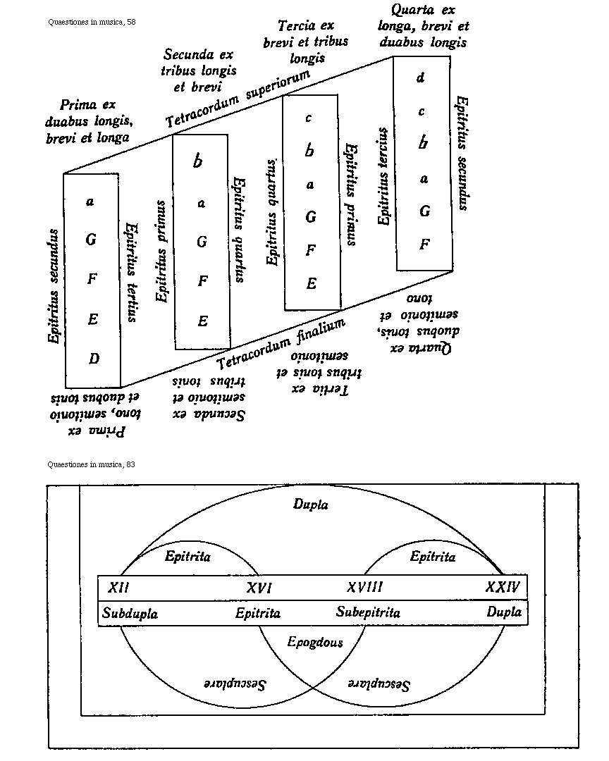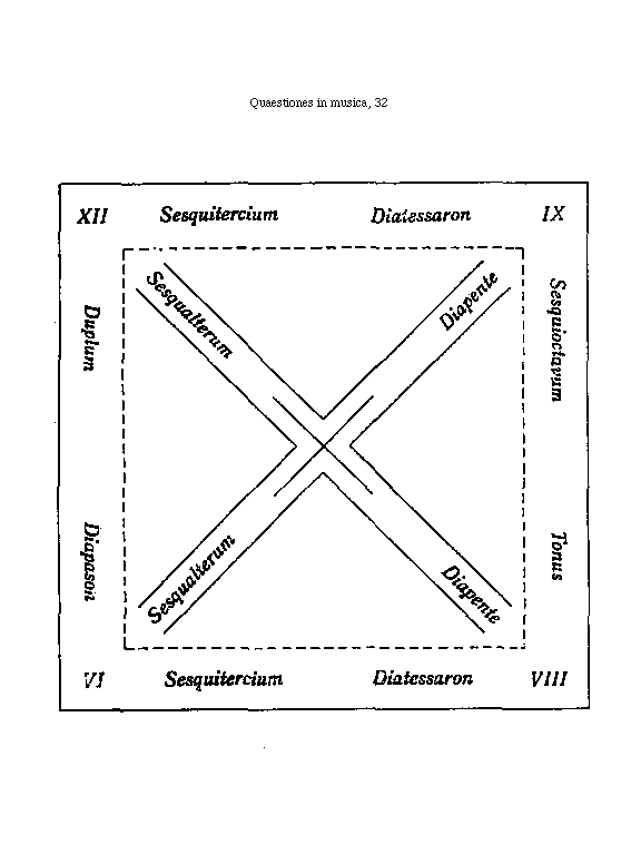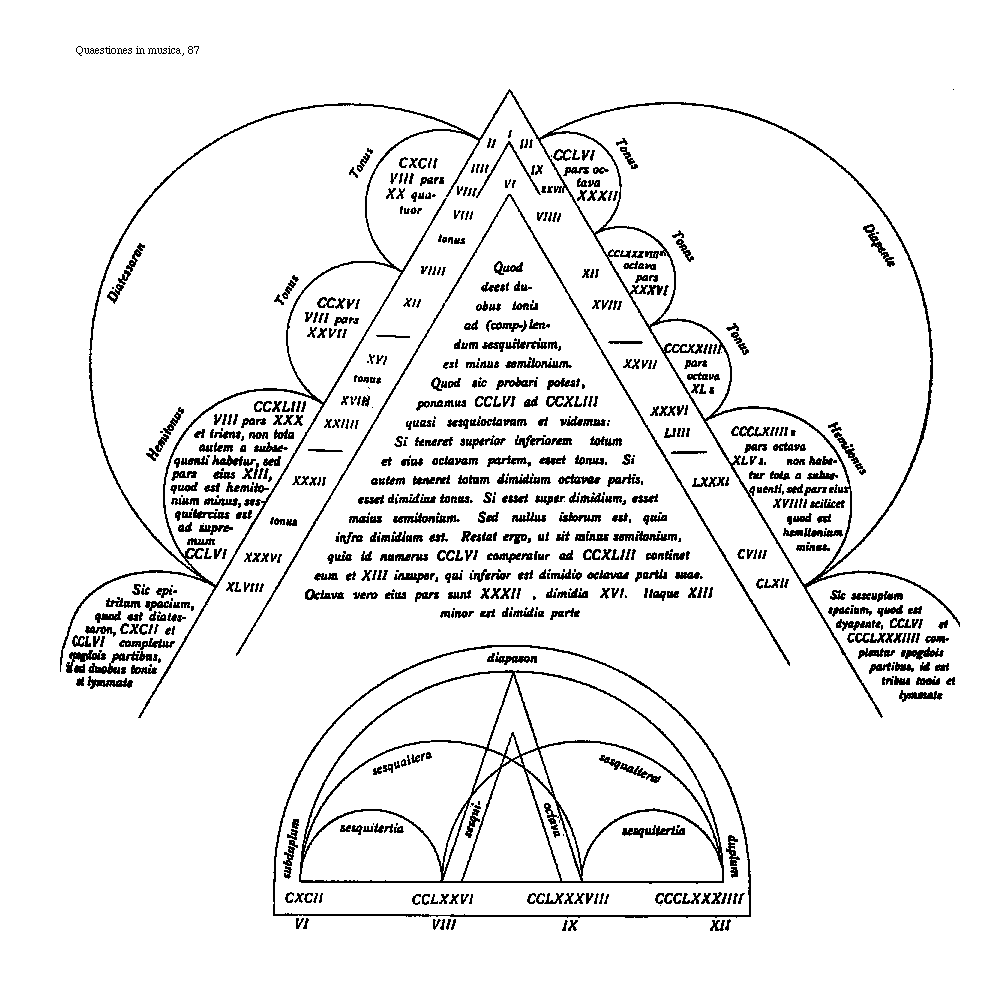 [87][Quaestiones in musica, 87; text: Diatessaron, Diapente, Hemitonus, Tonus, I, II, III, IIII, VI, VIII, IX, VIIII, XII, XVI, XVIII, XXIIII, XXVII, XXXII, XXXVI, XLVIII, LIIII, LXXXI, CVIII, CLXII, CXCII VIII pars XX quatuor, CCXVI VIII pars XXVII, CCXLIII VIII pars XXX et triens, non tota autem a subsequenti habetur, sed pars eius XIII, quod est hemitonium minus, sesquitercius est ad supremum CCLVI, Sic epitritum spacium, quod est diatessaron, CXCII et CCLVI completur epogdois partibus, id est duobus tonis et lymmate, CCLVI pars octava XXXII, CCLXXXVIII octava pars XXXVI, CCCXXIIII pars octava XL s, CCCLXIIII s pars octava XLV s. non habetur tota a subsequenti, sed pars eius XVIIII scilicet quod est hemitonium minus. Sic sescuplum spacium, quod est dyapente, CCLVI et CCCLXXXIIII complentur epogdois partibus, id est tribus tonis et lymmate, Quod deest duobus tonis ad (comp-)lendum sesquitercium, est minus semitonium. Quod sic probari potest, ponamus CCLVI ad CCXLIII quasi sesquioctavum et videmus: Si teneret superior inferiorem totum et eius octavam partem, esset tonus. Si autem teneret totum dimidium octavae partis, esset dimidius tonus. Si esset super dimidium, esset maius semitonium. Sed nullus istorum est, quia infra dimidium est. Restat ergo, ut sit minus semitonium, quia id numerus CCLVI comperatur ad CCXLIII continet eum et XIII insuper, qui inferior est dimidio octavae partis suae. Octava vero eius pars sunt XXXII, dimidia XVI. Itaque XIII minor est dimidia parte, subduplum, diapason, duplum, sesqualtera, sesquitertia, sesquioctava, CXCII, CCLXXVI, CCLXXXVIII, CCCLXXXIIII]
