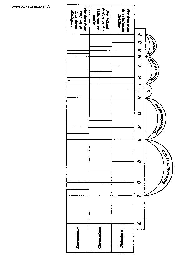 [14]Ad hoc singulae species diatessaron, diapente, diapason difficilius a tardioribus intellectu comprehenderentur, difficilius memoriae commendarentur, nisi oculis subiectae fidelibus in ipso instrumento dispositae notarentur.