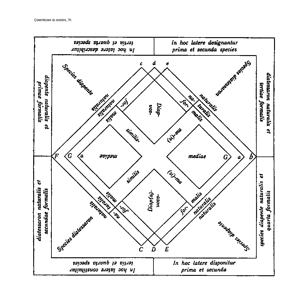 [Quaestiones in musica, 91; text: In hoc latere designantur prima et secunda species diatessaron naturalis et teritae formalis, In hoc latere disponitur prima et secunda species diapente naturalis et quarta formalis, In hoc latere constituitur tertia et quarta species diatessaron naturalis et secundae formalis, In hoc latere describitur tertia et quarta species diapente naturalis et primae formalis, Species diapente, Species diatessaron, naturalis, formalis, similis(si)ma, mediae, a, [sqb], c, d, e, C, D, E, F, G, Diap(a)son, Diapason]