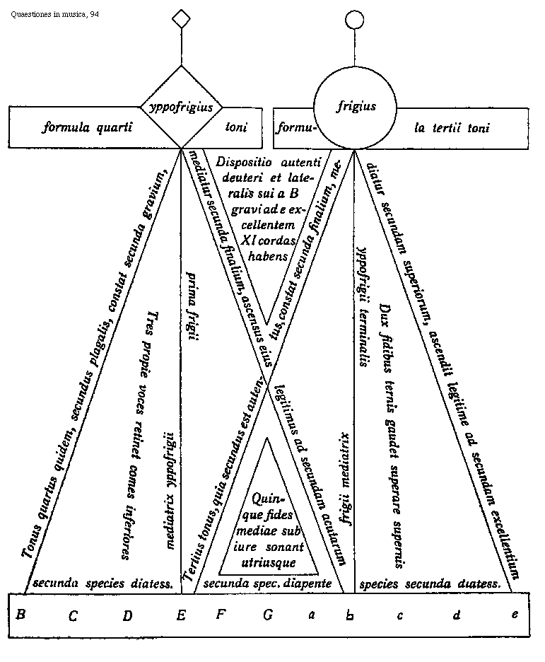 [Quaestiones in musica, 94; text: formula quarti toni, ypofrigius, formula tertii toni, frigius, Dispositio autenti deuteri et lateralis sui a B gravi ad e excellentem XI cordas habens, Tonus quartus quidem, secundus plagalis, constat secunda gravium, mediatur secunda finalium, ascensus eius legitimus ad secundam acutarum. Tertius tonus, quia secundus est autentus, constat secunda finalium, mediatur secundam superiorum, ascendit legitime ad secundam excellentium, Tres propie voces retinet comes inferiores, mediatrix yppofrigii, prima frigii, frigii mediatrix, yppofrigii terminalis, Dux fidibus ternis gaudet superare supernis, secunda species diatessaron, secunda species diapente, species secunda diatessaron, Quinque fides mediae sub iure sonant utriusque, B, C, D, E, F, G, a, [sqb], c, d, e]