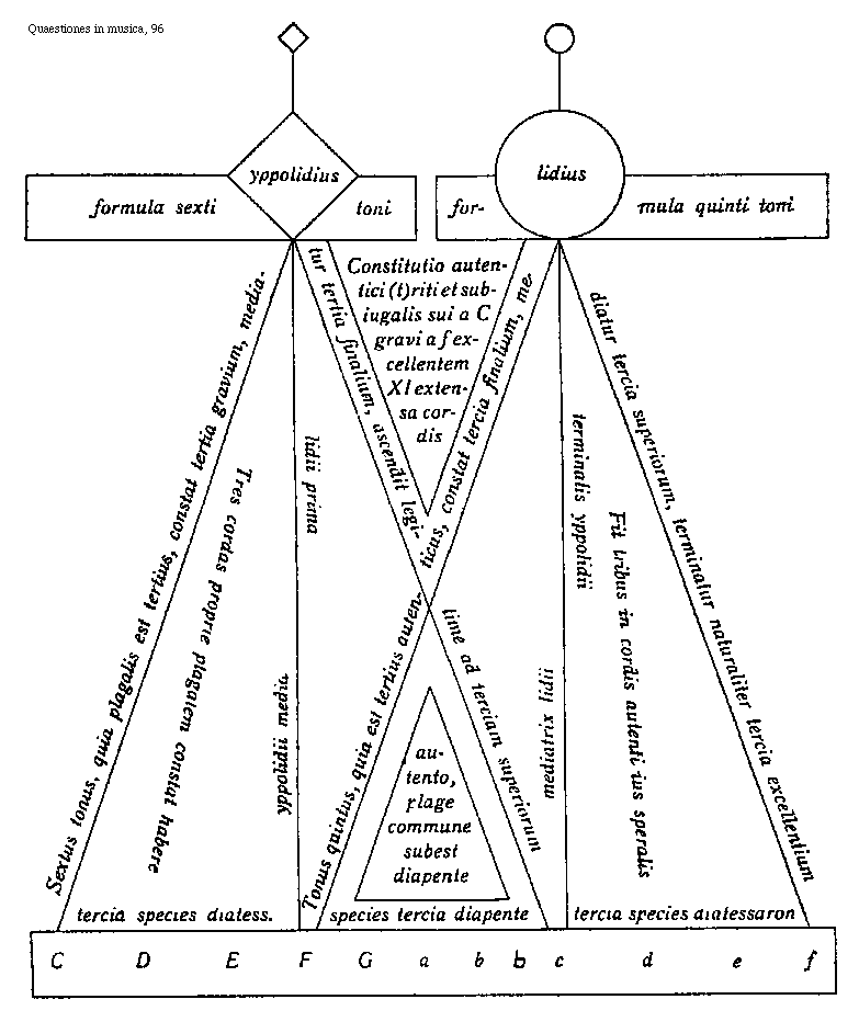 [96][Quaestiones in musica, 96; text: formula sexti toni, yppolidius, formula quinti toni, lidius, Sextus tonus, quia plagalis est tertius, constat tertia gravium, mediatur tertia finalium, ascendit legitime ad terciam superiorum, Tonus quintus quia est tertius autenticus, constat tercia finalium, mediatur tercia superiorum, terminatur naturaliter tercia excellentium, Constitutio autentici (t)riti et subiugalis sui a C gravi a f excellentem XI extensa cordis, autento, plage commune subest diapente, Tres cordas proprie plagalem constat habere, yppolidii media, lidii prima, mediatrix lidii, terminalis yppolidii, Fit tribus in cordis autenti ius speralis, tercia species diatessaron, species tercia diapente, C, D, E, F, G, a, b, [sqb], c, d, e, f]