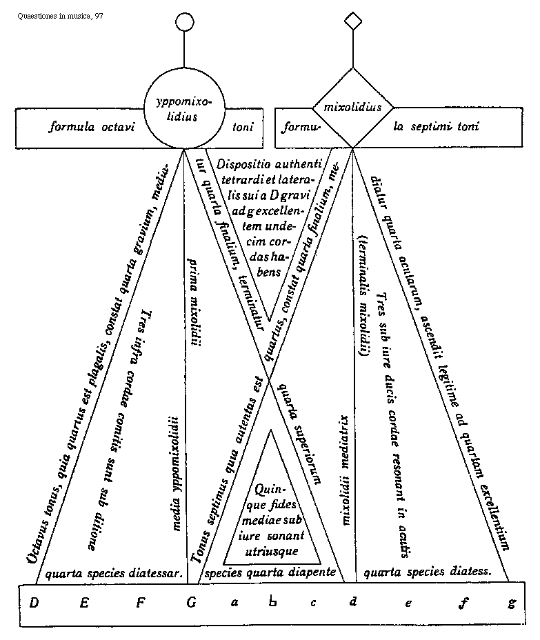 [97][Quaestiones in musica, 97; text: formula octavi toni, yppomixolidius, formula septimi toni, mixolidius, Octavus tonus, quia quartus est plagalis, constat quarta gravium, mediatur quarta finalium, terminatur quarta superiorum, Tonus septimus quia autentus est quartus, constat quarta finalium, mediatur quarta acutarum, ascendit legitime ad quartam excellentium, Dispositio authenti tetrardi et lateralis sui a D gravi ad g excellentem undecim cordas habens, Quinque fides mediae sub iure sonant utriusque, Tres infra cordae comitis sunt sub ditione, media yppomixolidii, prima mixolidii, mixolidii mediatrix, (terminalis mixolidii), Tres sub iure ducis cordae resonant in acutis, quarta species diatessaron, species quarta diapente, D, E, F, G, a, [sqb], c, d, e, f, g]