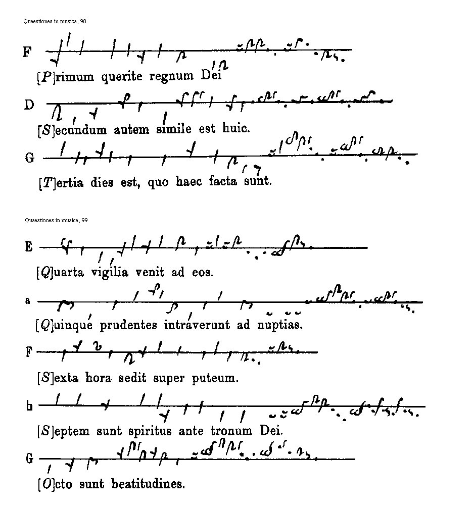[Quaestiones in musica, 98; text: [P]rimum querite regnum Dei, [S]ecundum autem simile est huic. [T]ertia dies est, quo haec facta sunt.]