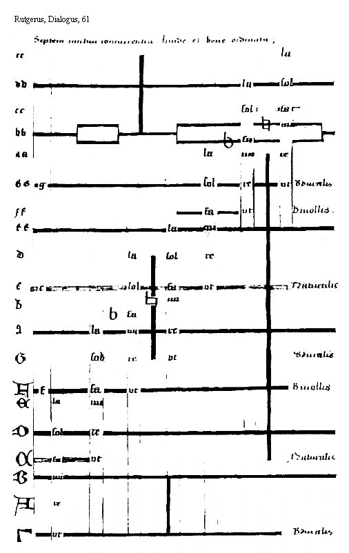 [61][Rutgerus, Dialogus, 61; text: Septem cantuum concurrentia. lucide et bene ordinata; [Gamma], A, B, C, D, E, F, G, a, b, c, d, ee, ff, gg, aa, cc, dd, ut, re, mi, fa, sol, la, duralis, mollis, naturalis]