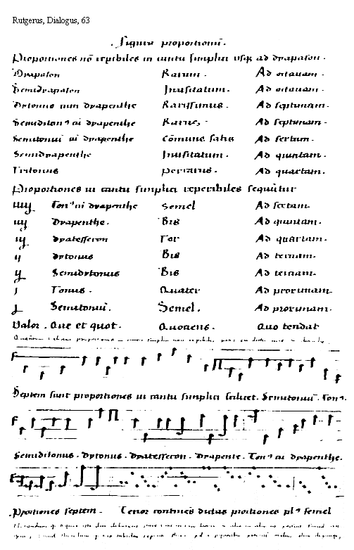 [63][Rutgerus, Dialogus, 63; text: Figura proportionum. Proportiones non reperibiles in cantu simplici usque ad dyapason. Demidyapason, Dytonus cum dyapenthe, Semiditonus, Semitonium, Semidyapenthe, Tritonus, Rarum. Inusitatum. Rarissimus. Rarus. Comune satis, Perratus. Ad octauam. septimam. sextam. quintam. quartam. Proportiones in cantu simplici reperibiles sequitur, iiii1/2, iii1/2, ii1/2, ii, i1/2, i, 1/2, Tonus, dyatesseron, Semidytonus, Semel, Bis, Ter, Quater, tertiam, prorimam. Valor. Que et quot. Quotiens. Quo tendat, Septem sunt proportiones in cantu simplici scilicet. dyapente. Proportiones septem. Tenor continens dictas proportiones plus semel]
