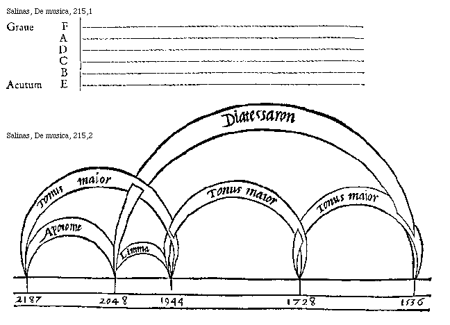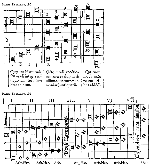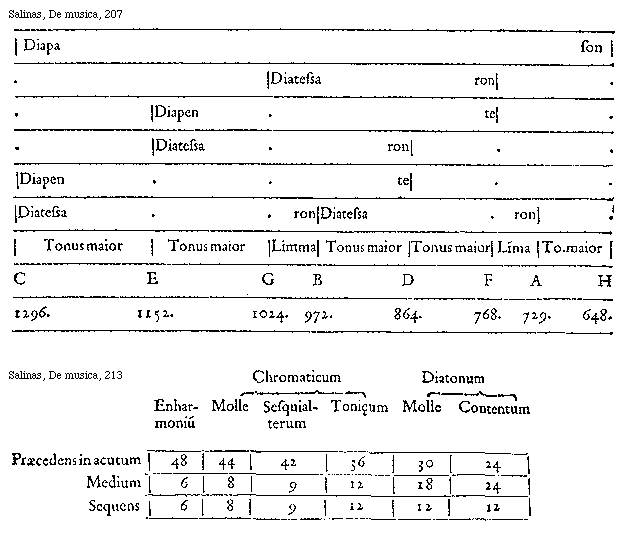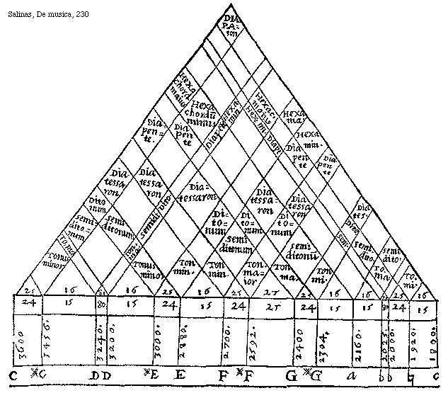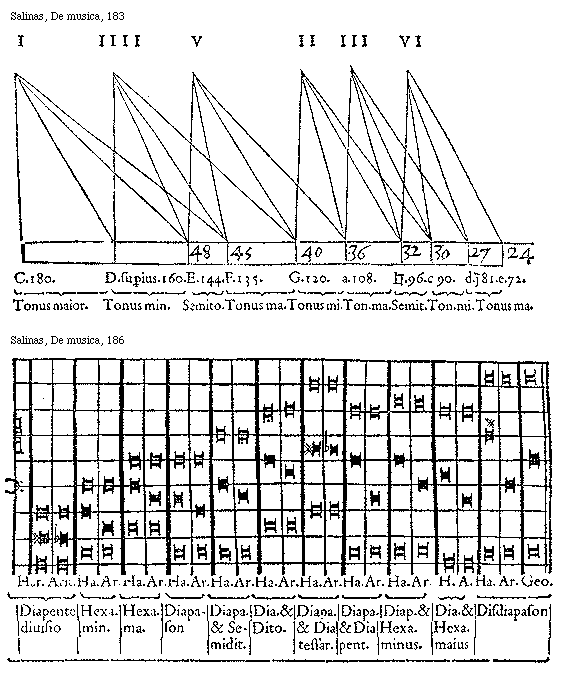 Source:Francisci Salinae Burgensis Abbatis Sancti Pancratii de Rocca Scalegna in regno Neapolitano, et in Academia Salmanticensi Musicae Professoris, de Musica libri Septem, in quibus eius doctrinae veritas tam quae ad Harmoniam, quam quae ad Rhythmum pertinet, iuxta sensus ac rationis iudicium ostenditur, et demonstratur (Salamanca: Mathias Gastius, 1577), 176–234.