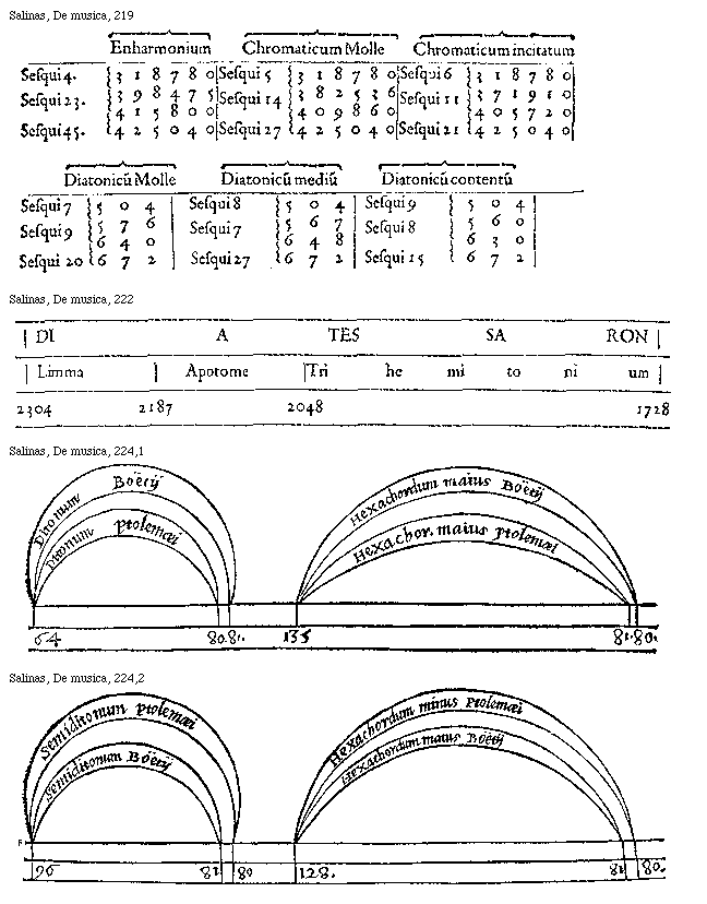 [Salinas, De musica, 224,2; text: Semiditonum Ptolemaei, Semiditonum Boetij, Hexachordum minus Ptolemaei, Hexachordum maius Boetij, 96, 81, 80, 128]