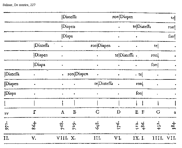 [227][Salinas, De musica, 227; text: Diatessaron, Diapente, Diapason, [gamma][gamma], [Gamma], A, B, C, D, E, F, G, a, 972. 864. 768. 729. 648. 576. 512. 486. 432. 374. II. V. VIII. X. III. VI. IX. I. IIII. VII.]