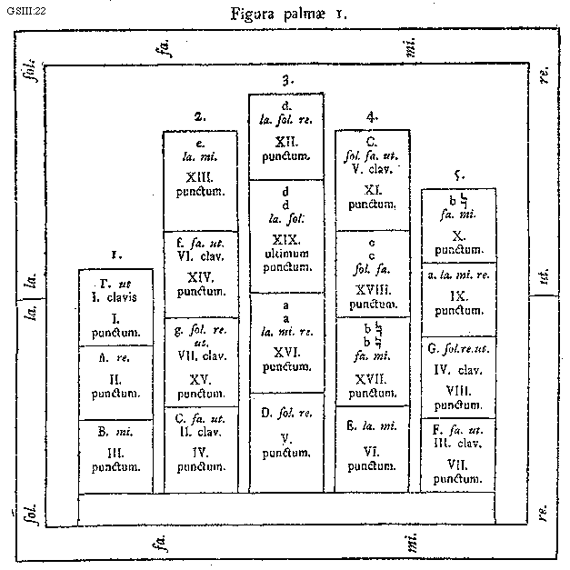 [22][GSIII:22; text: Figurae palmae 1. ut. re. mi. fa. sol. la. 1. 2. 3. 4. 5. I clavis, II. clav., III. clav., IV. clav., V. clav., VI. clav., VII. clav., I. punctum.,II. punctum., III. punctum., IV. punctum., V. punctum., VI. punctum., VII. punctum., VIII. punctum., IX. punctum., X. punctum., XI. punctum., XII. punctum., XIII. punctum., XIV. punctum., XV. punctum., XVI. punctum., XVII. punctum., XVIII. punctum., XIX. ultimum punctum. [Gamma]. ut, A. re., B. mi., e. la. mi., f. fa. ut., g. sol. re. ut., C. fa. ut., d. la. sol. re., dd la. sol., aa la. mi. re., D. sol. re,.C. sol. fa. ut., cc sol. fa., b[sqb]b[sqb] fa. mi., E. la. mi., b[sqb] fa. mi., a. la. mi. re., G. sol. re. ut., F. fa. ut.]
