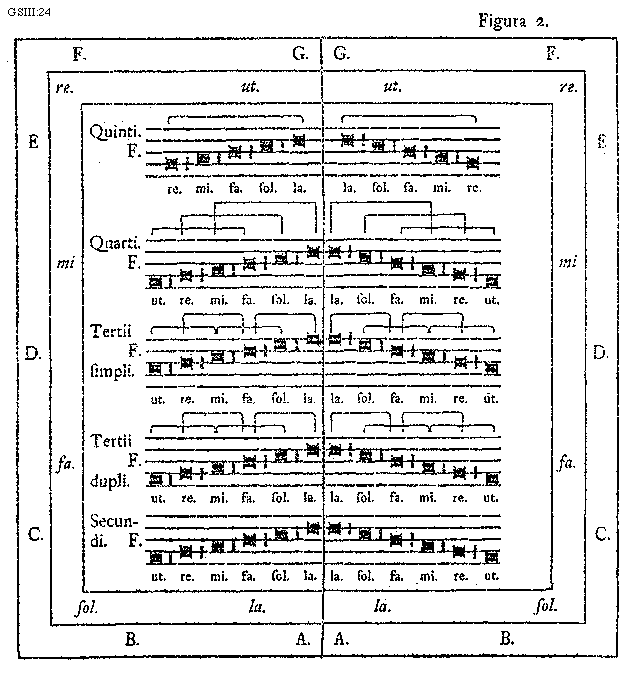 [GSIII:24; text: Figura 2. G. F. E, D. C. B. A. ut. re. mi. fa. sol. la. Quinti. Quarti. Tertii simpli. Tertii dupli. Secundi.]