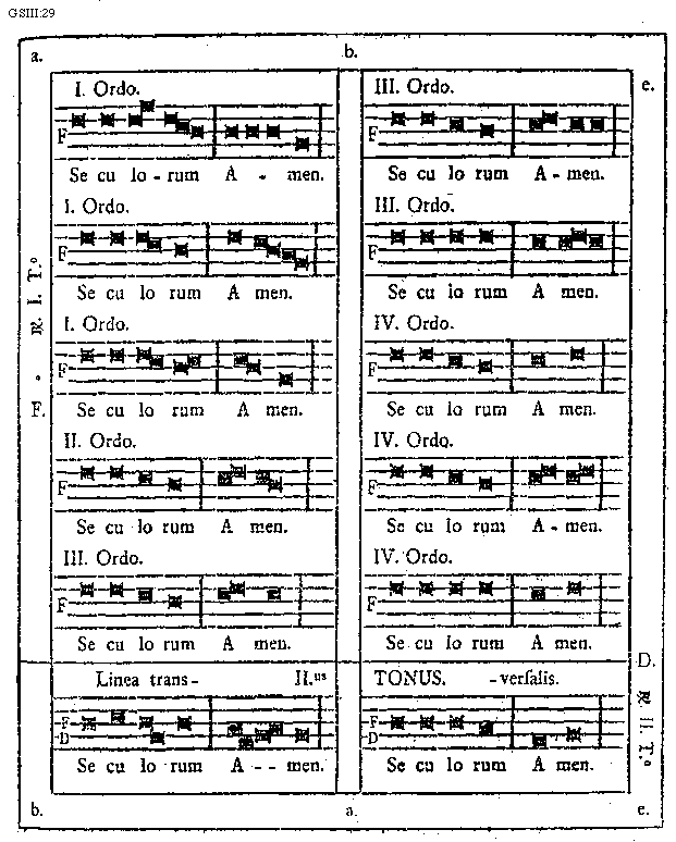[GSIII:29; a. b. e. D. Responsoria Secundo Tono. F. Responsoria Primo Tono. Primus Ordo. Secundus Ordo. Tertius Ordo. Quartus Ordo. Seculorum Amen. Secundus Tonus. Linea Transversalis.]