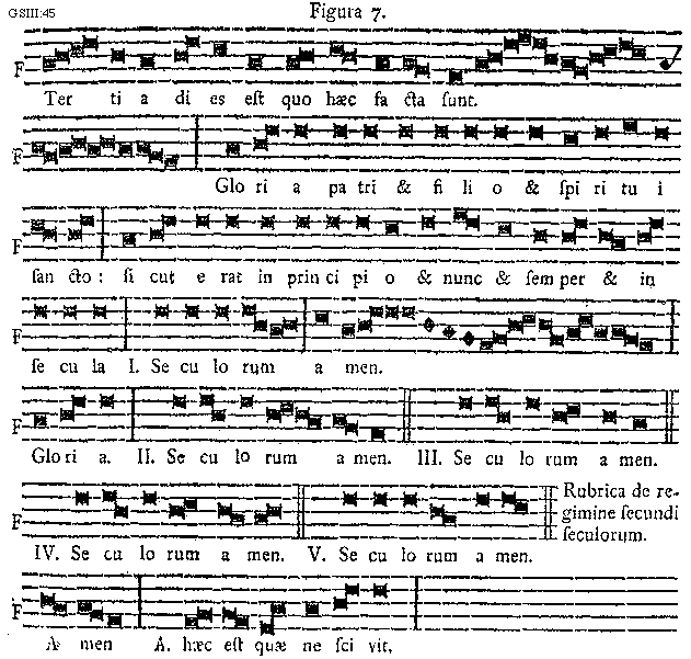 Sed caveant, qui habent corruptas notas in libris suis, et faciant eas diligenter a bono musico emendari, et addiscant, si placuerit eis, veritatem cantare. Non est bonum neque honestum, semper gloriari cum phantasticis cantibus, et Deum inhonorare. Item quidam praeeminentes in scientia ista, ut asserunt, dedignantur concedere, quod Officia regantur per seculorum directo sicuti antiphonae. Et ego dico audacter, quod ita similiter reguntur et debent regi per seculorum, sicuti minor antiphona de mundo. Ideo praemissum fuit in principio, quod ultimus punctus de seculorum de Gloria patri de primo tono debeat poni in F. sicuti ponitur de aliis seculorum, et postea Amen eiusdem seculorum sequetur regimen et vias debiti regiminis sui, quantum ad officium, cui debebit servire.