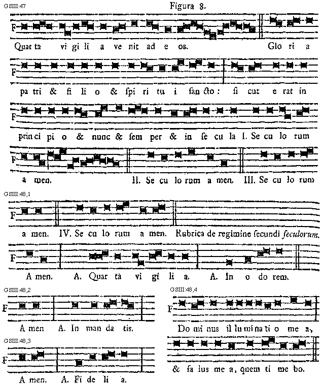 [GSIII:47; text: Figura 8. Quarta vigilia venit ad eos. Gloria patri et filio et spiritui sancto: sicut erat in principio et nunc et semper et in secula I. II. III. Seculorum amen.]