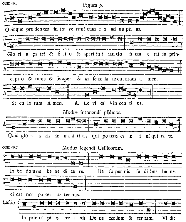 [49][GSIII:49,1; text: Figura 9. Quinque prudentes intraverunt cum eo ad nuptias. Gloria patri et filio et spiritui sancto sicut erat in principio et nunc et semper et in secula seculorum amen. Seculorum Amen. Antiphona, Levita Vincentius. Modus intonandi psalmos. Quid gloria in malitia, qui potens es in iniquitate.]
