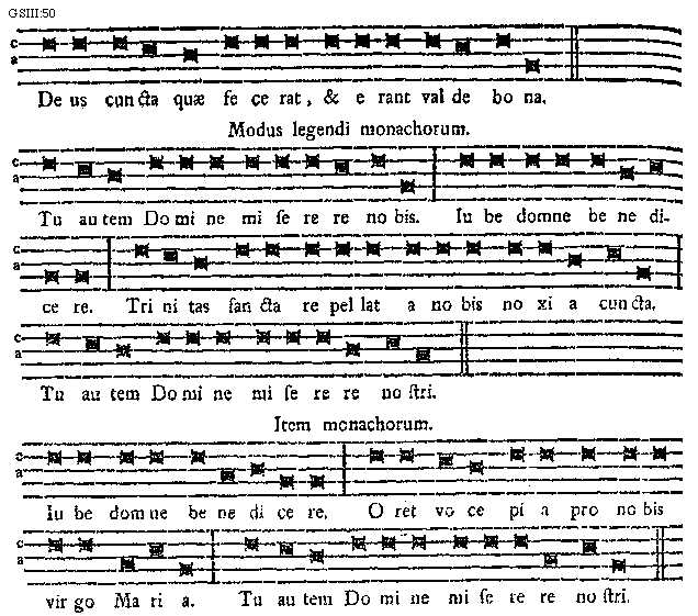 [50][GSIII:50; text: Deus cuncta quae fecerat, et erant valde bona. Modus legendi monachorum. Tu autem Domine miserere nobis. Iube domne benedicere. Trinitas sancta repellat a nobis noxia cuncta. Tu autem Domine miserere nostri. Item monachorum. Oret voce pia pro nobis virgo Maria.]
