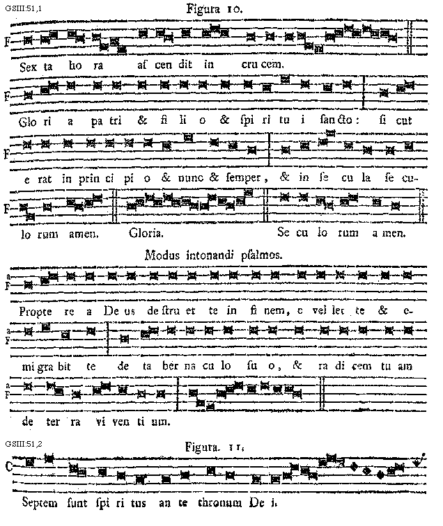 [51][GSIII:51,1; text: Figura 10. Sexta hora ascendit in crucem. Gloria patri et filio et spiritui sancto: sicut erat in principio et nunc et semper, et in secula seculorum amen. Gloria. Seculorum amen. Modus intonandi psalmos. Propterea Deus destruet te in finem, evellet te et emigrabit te de tabernaculo suo, et radicem tuam de terra viventium.]