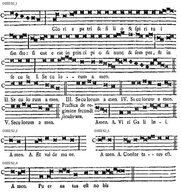 [52][GSIII:52,1; text: Gloria patri et filio et spiritui sancto: sicut erat in principio et nunc et semper, et in secula I. II. III. IV. V. Seculorum amen. Practica de regimine secundi seculorum. Amen. Antiphona, Viri Galilaei.]