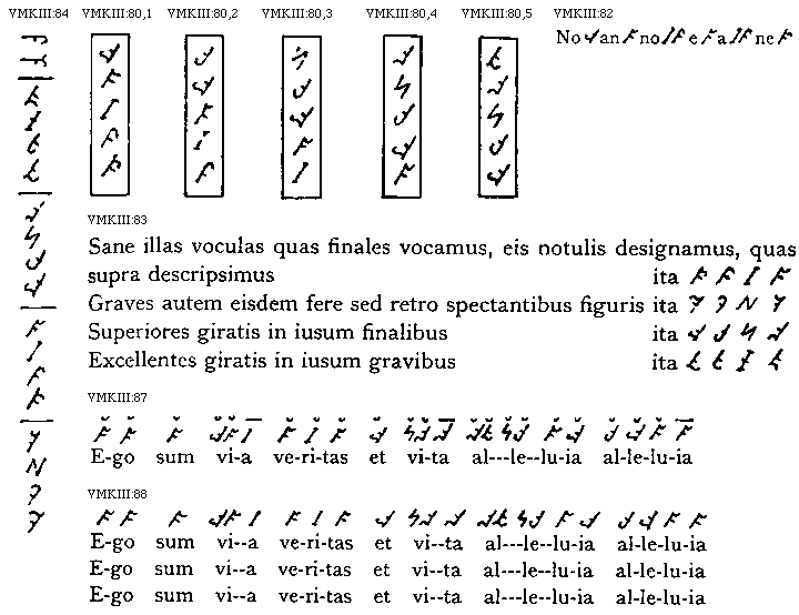 [VMKIII:83; text: Sane illas voculas quas finales vocamus, eis notulis designamus, quas supra descripsimus ita, Graves autem eisdem fere sed retro spectantibus figuris ita, Superiores giratis in iusum finalibus ita, Excellentes giratis in iusum gravibus ita]