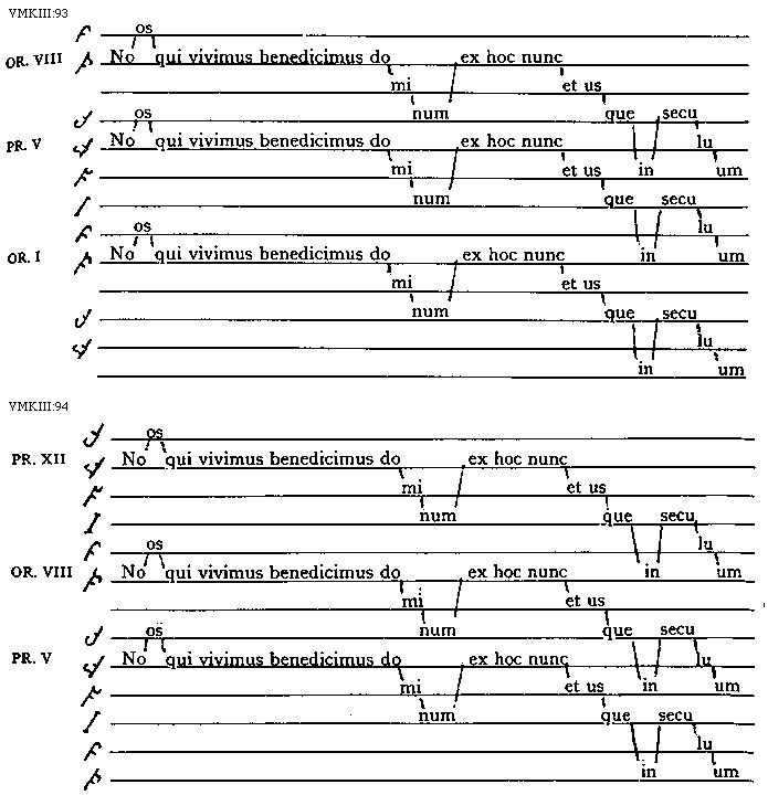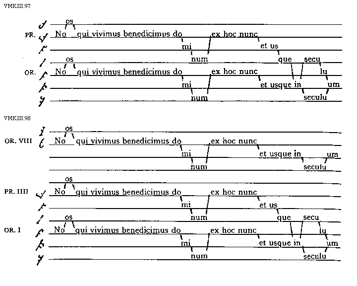 [VMKIII:98; text: PRINCIPALIS, VIII, IIII, I, ORGANALIS, Nos qui vivimus benedicimus dominum ex hoc nunc et usque in seculum]