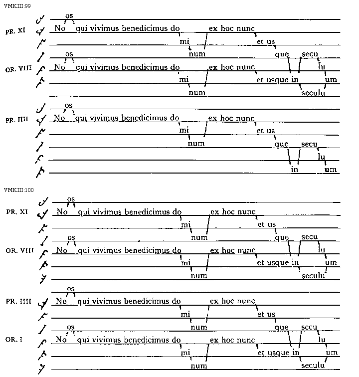 [VMKIII:100; text: PRINCIPALIS, XI, VIII, IIII, I, ORGANALIS, Nos qui vivimus benedicimus dominum ex hoc nunc et usque in seculum]