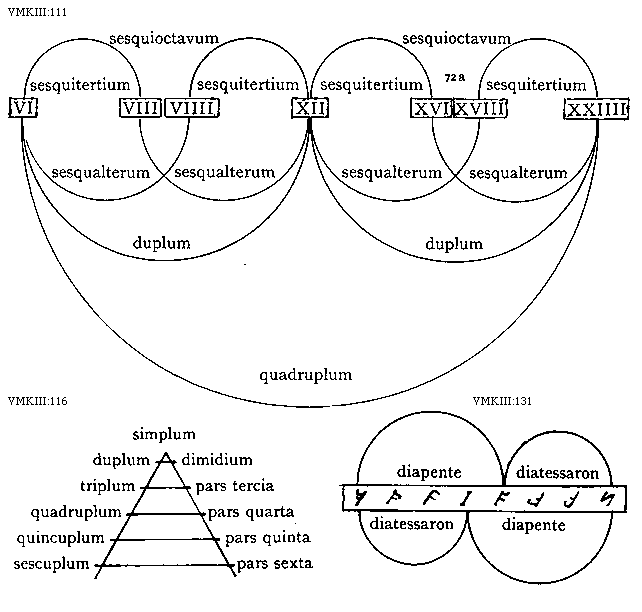 [112]Praeterea perfectiores sunt symphoniae in diapason ac disdiapason quam in diatessaron et diapente, quia hae sunt multiplicis inaequalitatis, illae superparticularis. Perfectior est autem multiplex inaequalitas superparticulari inaequalitate.