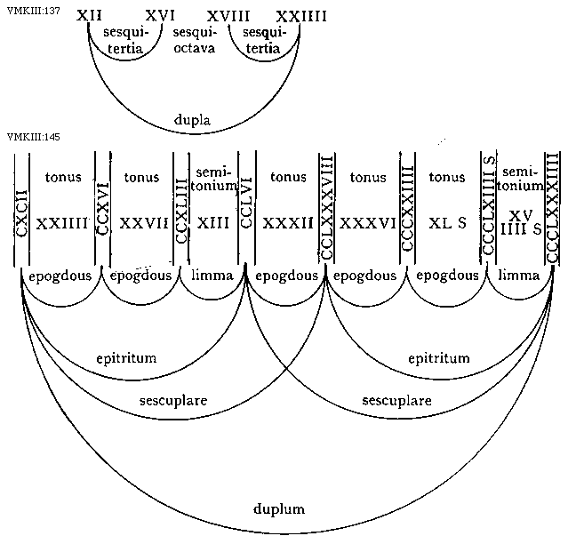[137]Metieris fistulam ad fistulam duplo longiorem. Ad brevem fistulam metieris epitritam. Ad longam fistulam metieris subepitritam. Ponesque in ordine subduplam, epitritam, subepitritam, duplam. Sicque inter duas medias epogdous naturaliter cadit. Cuius intervallo utraque fit ulteriori suo lateri sescuplaris, utraque proximiori sibi lateri epitrita. Et amplius: Si epitritam et sescuplam duplamque duplices, simul aliud diapason spacium eodem quo prius ordine effecisti. [descriptio 3 in marg.]