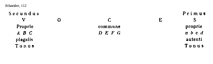 [Schneider, 112; text: Secundus, Primus, Voces, Proprie, commune plagalis, autenti, Tonus, A, B, C, D, E, F, G, a, b, c, d]