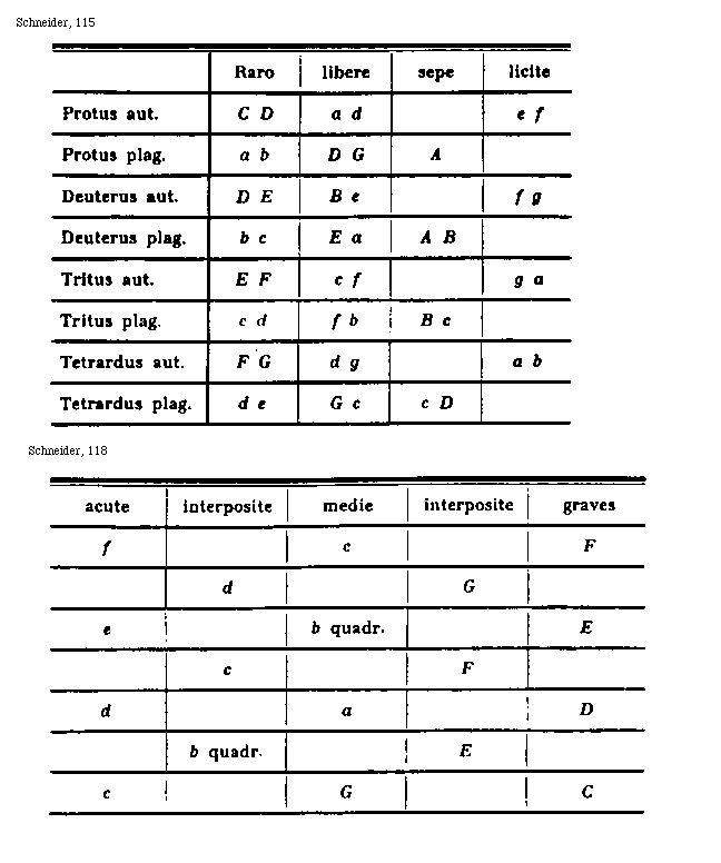 [Schneider, 115; text: Raro, libere, sepe, licite, Protus autentus, Protus plagis, Deuterus autentus, Deuterus plagis, Tritus autentus, Tritus plagis, Tetrardus autentus, Tetrardus plagalis, A, B, C, D, E, F, g, a, b, c, d, e, f]