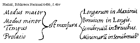 [Madrid, Biblioteca Nacional 6486, f.46v; text: Modus maior, Longarum in Maximis. Modus minor, Breuium in Longis. Tempus est mensura Semibreuium in Breuibus. Prolatio, Minimarum in Semibreuibus.]