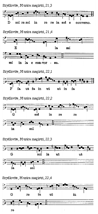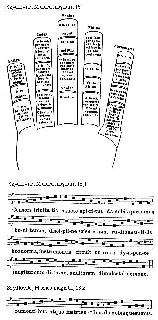 [Szydlovite, Musica magistri, 15; text: Pollex, Index, Medius, Fidius, Auricularis, [Gamma] ut, hic incipitur primus cantus h duralis caput, A re venter, h mi, per quem canitur prima coniuncta, e la mi, per quem b canitur fa loco mi sexta coniuncta, f fa ut, per quem canitur h inter mi loco fa septima coniuncta, g sol re ut, tercius cantus h duralis, C fa ut, hic primus cantus naturalis, d la sol re, caput, dd la sol, collum, aa la mi re, per quem canitur b inter fa loco mi octava coniuncta, venter, D sol re, c sol fa ut, per quem canitur h mi loco fa quinta coniuncta, cc sol fa, bb fa, hh mi, E la mi, per quem b canitur fa loco mi secunda coniuncta, b fa h mi, a la mi re, per quem canitur b fa loco mi quarta coniuncta, G sol re ut secundus h duralis, F fa ut, hic incipitur primus cantus b mollis, per quem canitur h contra mi loco fa tercia coniuncta]