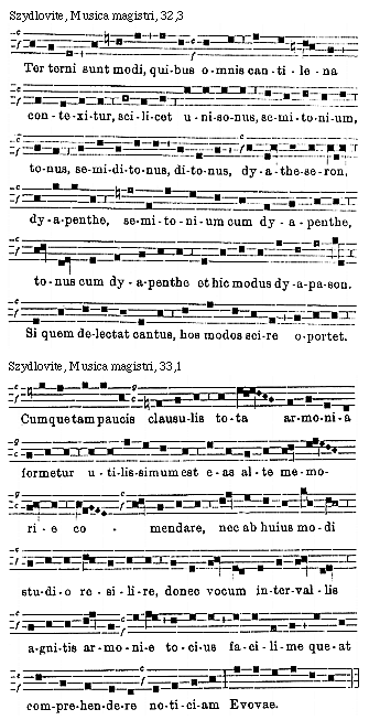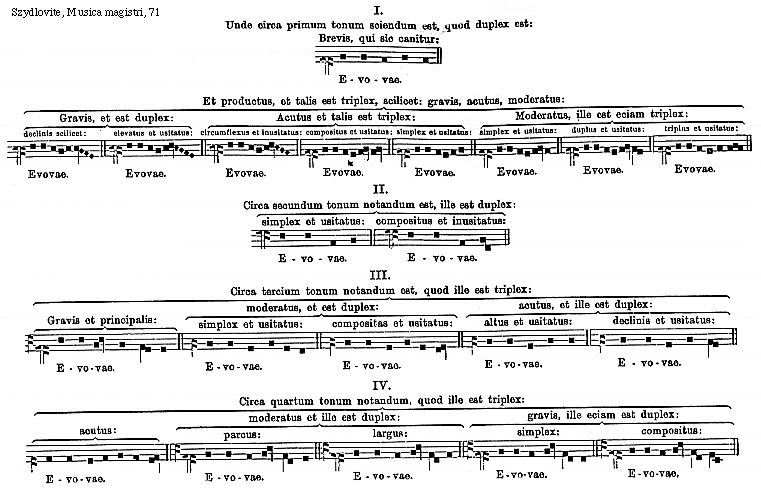[71][Szydlovite, Musica magistri, 71; text: I. II. III. IV. Unde circa primum tonum sciendum est, quod duplex est: Brevis, qui sic canitur: Evovae. Et productus, et talis est triplex, scilicet: gravis, acutus, moderatus: Gravis, et est duplex: Acutus et talis est triplex: Moderatus, ille est eciam triplex: declinis scilicet: elevatus et usitatus: circumflexus et inusitatus: compositus et usitatus: simplex et usitatus: duplus et usitatus: triplus et usitatus: Circa secundum tonum notandum est, ille est duplex: compositus et inusitatus: Circa tercium tonum notandum est, quod ille est triplex: moderatus, et est duplex: Gravis et principalis: altus et usitatus: declinis et usitatus: Circa quartum tonum notandum, quod ille est triplex: moderatus et ille est duplex: ille eciam est duplex: parcus: largus: simplex: compositus:]