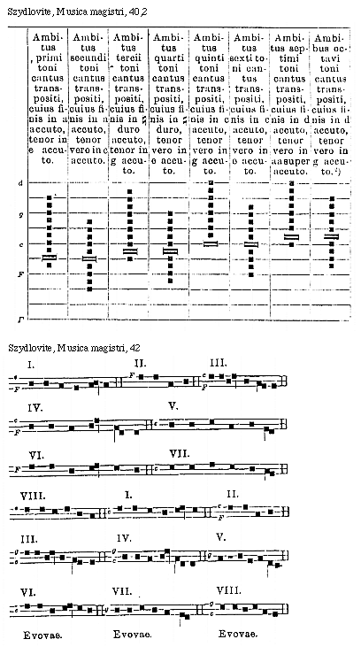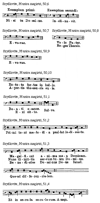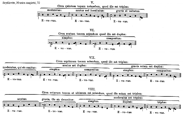 [72][Szydlovite, Musica magistri, 72; text: V. VI. VII. VIII. Circa quintum tonum notandum, quod ille est triplex: moderatus: acutus sed inusitatus: gravis et usitatus: Evovae. Circa sextum tonum sciendum quod ille est duplex: simplex: compositus: Circa septimum tonum sciendum, quod ille est triplex: acutus est duplex: gravis eciam est duplex: moderatus, qui sic canitur: Circa octavum tonum et ultimum est sciendum, quod ille eciam est triplex: moderatus est triplex: acutus: gravis, ille sic decanitur: simplus: duplus: triplus:]