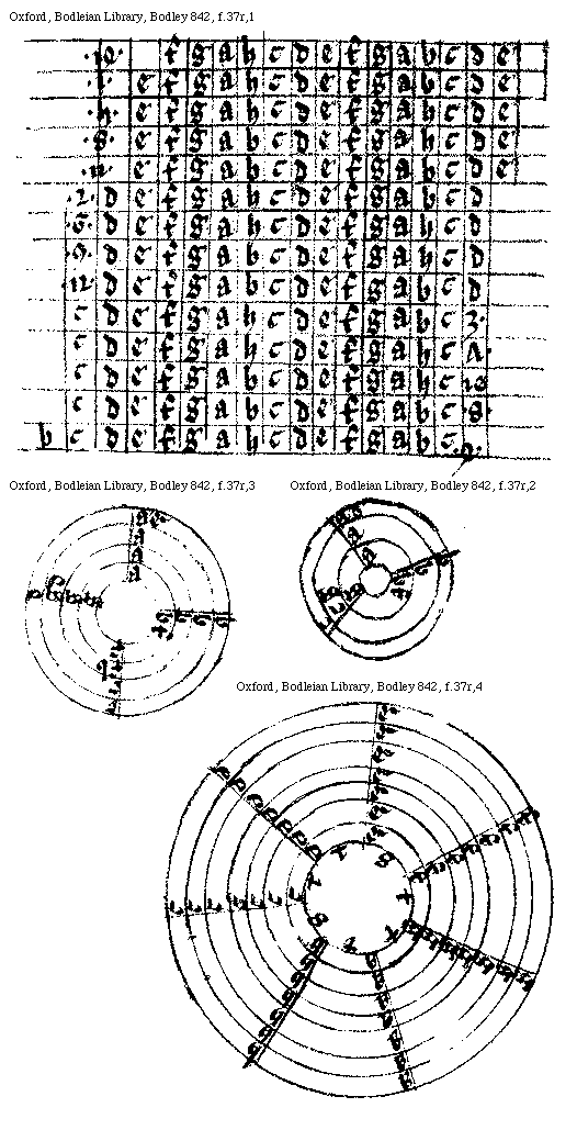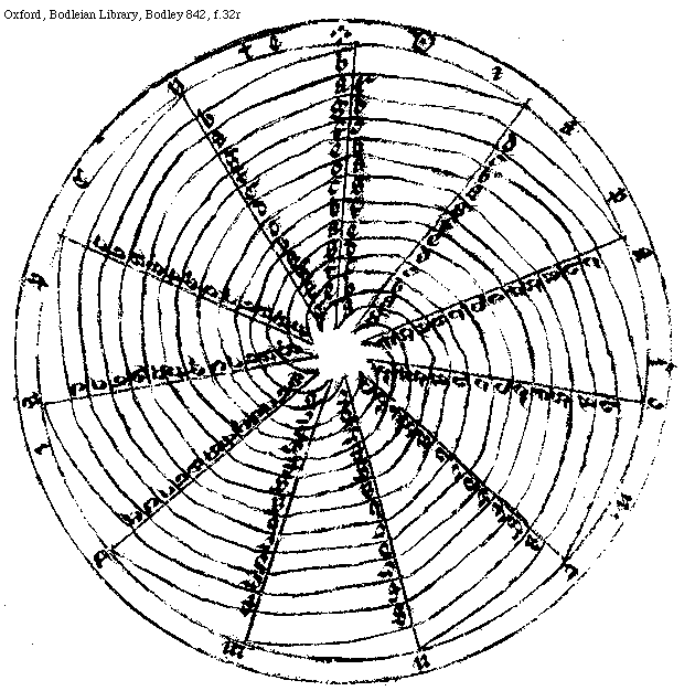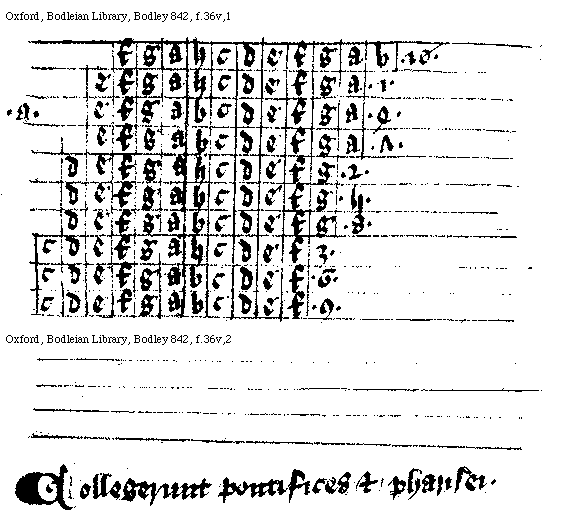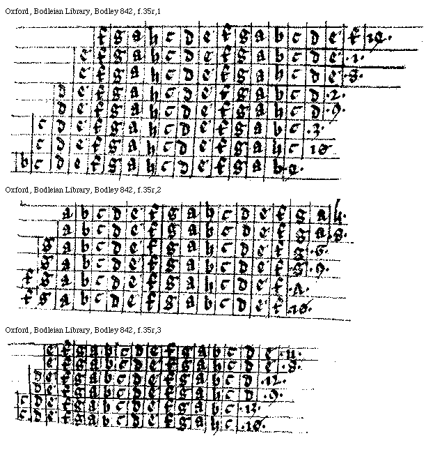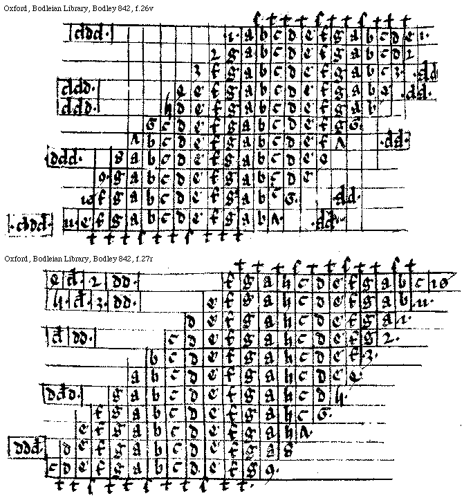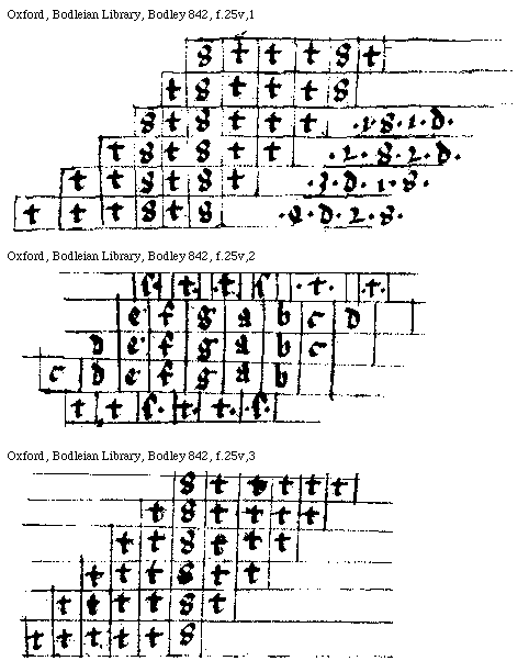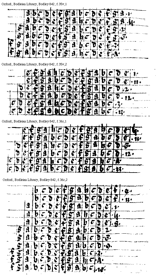 [Oxford, Bodleian Library, Bodley 842, f.25r,2; text: t. s. f. g. a. [sqb]. b. c. d. e. i. .ij. .iji. ijij .v.]