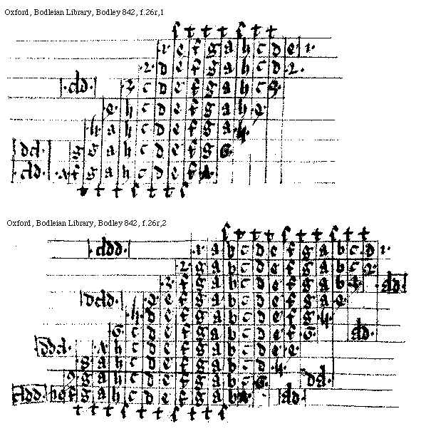 [f.32r][Oxford, Bodleian Library, Bodley 842, f.32r; text: Diapason cum diapente, a, b, c, d, [roe], e, f, g]