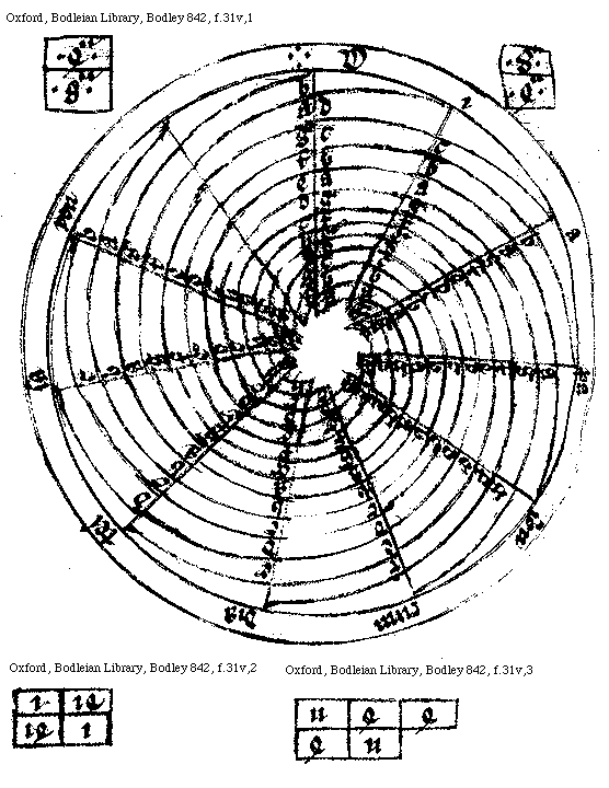 [Oxford, Bodleian Library, Bodley 842, f.31r,3; text: diapason, [roe], e, f, g, a, b, [sqb], c, d]