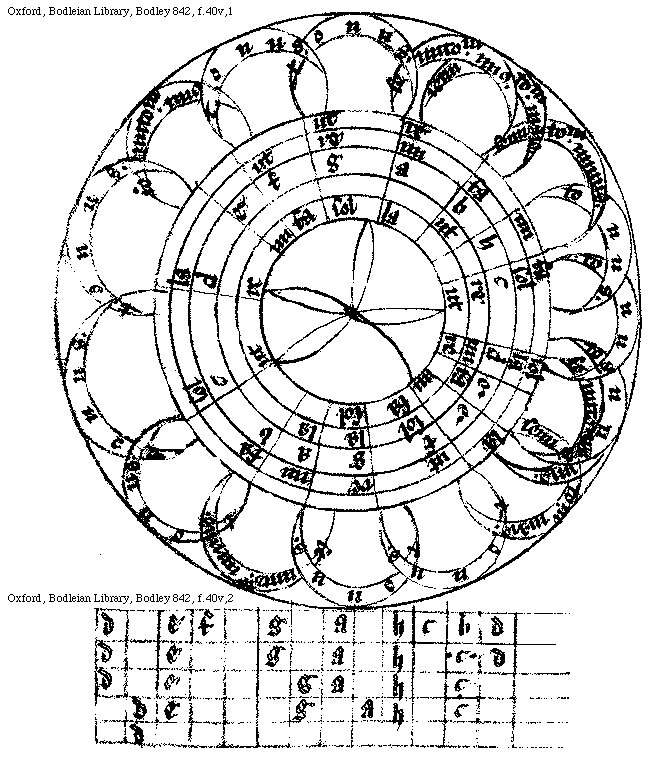 [Oxford, Bodleian Library, Bodley 842, f.39r,2; text: ut, re, mi, fa, sol, la, c, d, e, f, g, a, b, [roe], [sqb], semitonium minus, tonus]